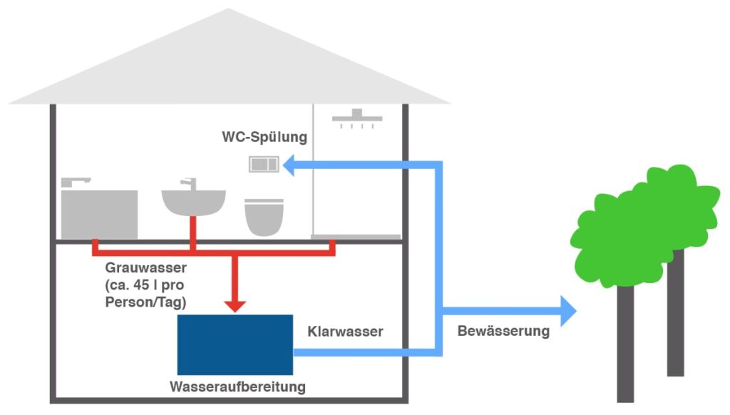 Der Vorteil ist: Die Grauwassernutzung ist von der anfallenden Niederschlagsmenge unabhängig. Grauwasser fällt in einem Haushalt täglich in nahezu gleicher Menge an.